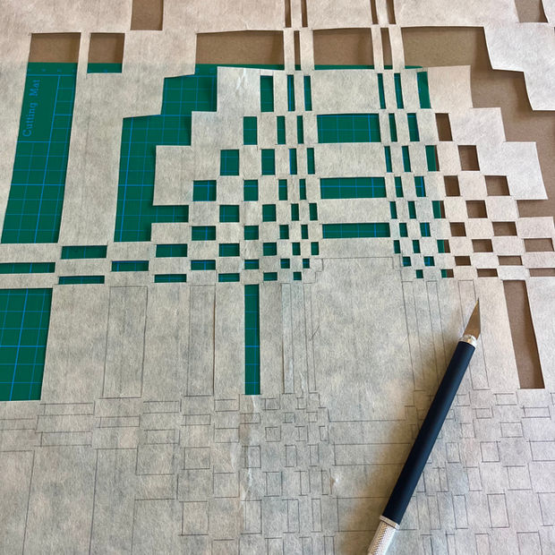 This new body of work marks a departure from the abstract organic forms and saturated gradients that have defined my paper-cut practice. Inspired by the geometric precision and the gridded language of constructed textiles, optical quilts, and weave patterns, my work engages in a dynamic process of constructing and deconstructing visual grids. Beginning with hand-drawn and digitally rendered optical patterns in black & white, I scale my designs before drawing and cutting out the negative spaces to reveal intricate undulating forms.